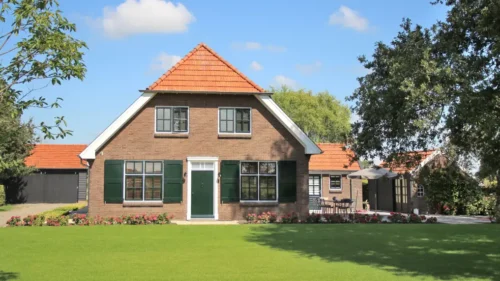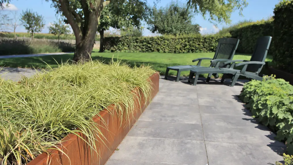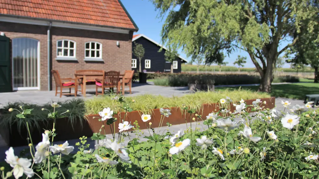 In een grote landelijke tuin is vanzelfsprekend veel natuur opgenomen. In deze tuin ligt de nadruk op een groot gazon, dat perfect aansluit op het omliggende weidelandschap. De weelderige borders versterken de weidsheid van het gazon, voor een strakke scheiding tussen gras en border is onder andere gebruik gemaakt van onze kantopsluiting van cortentstaal. Door de warme roesttinten van het materiaal combineert de kantafsluiting perfect met de rustieke sfeer van de tuin en de boerderij.