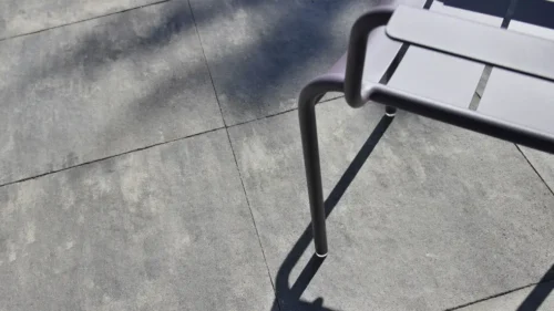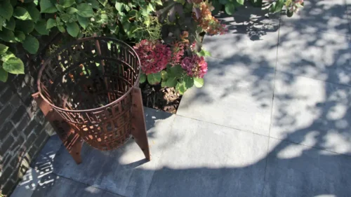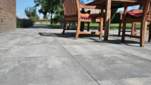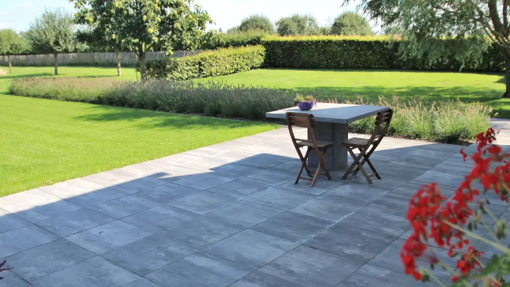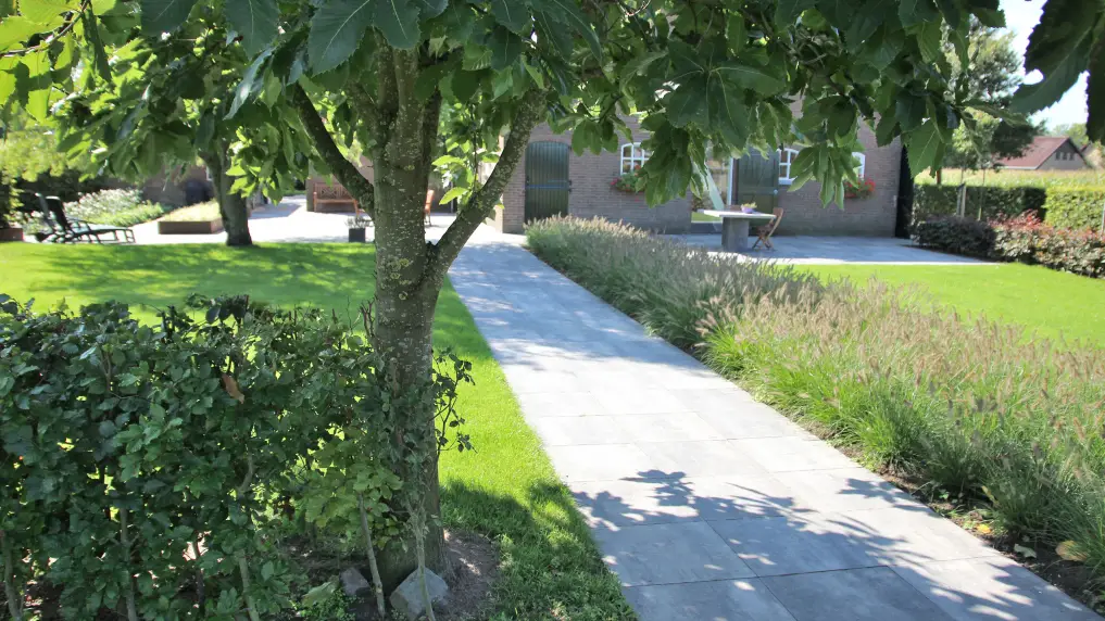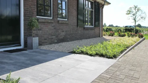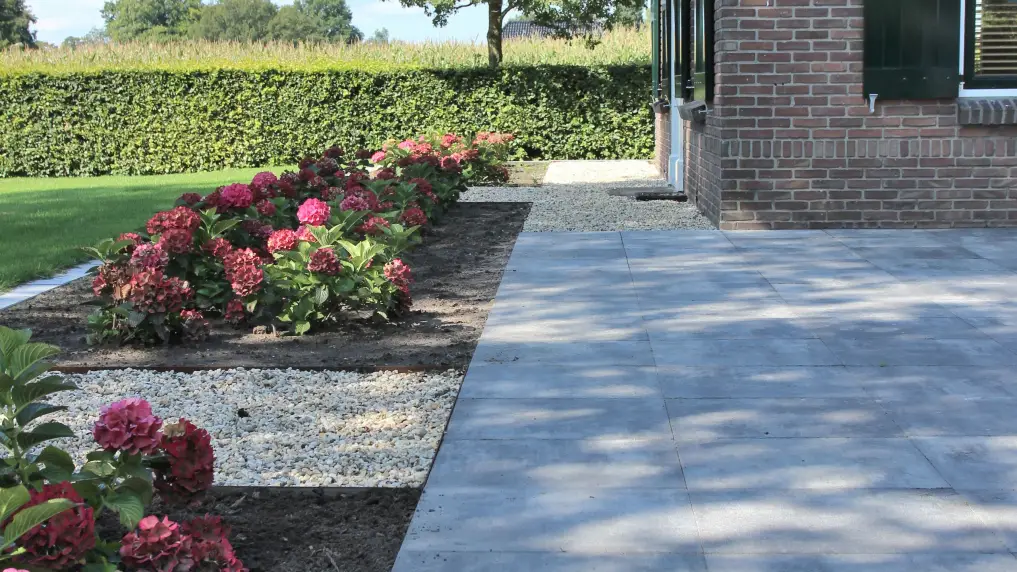 De border is in de lengte van de landelijke tuin geplaatst om de diepte van de tuin te accentueren. Dat geldt ook voor het tuinpad langs een dichtbeplante border van prachtige lavendel. Dit tuinpad is – net als de rest van het terras –aangelegd met strakke betontegels, die voor een verrassend contrast zorgen met de natuurlijke accenten in de tuin. De voegen zijn gedicht met een voegmortel, wat het terras uiterst onderhoudsvriendelijk maakt. Deze strakke bestrating wordt afgewisseld met grind en klinkers, waarmee het authentieke karakter van de boerderij wordt versterkt.