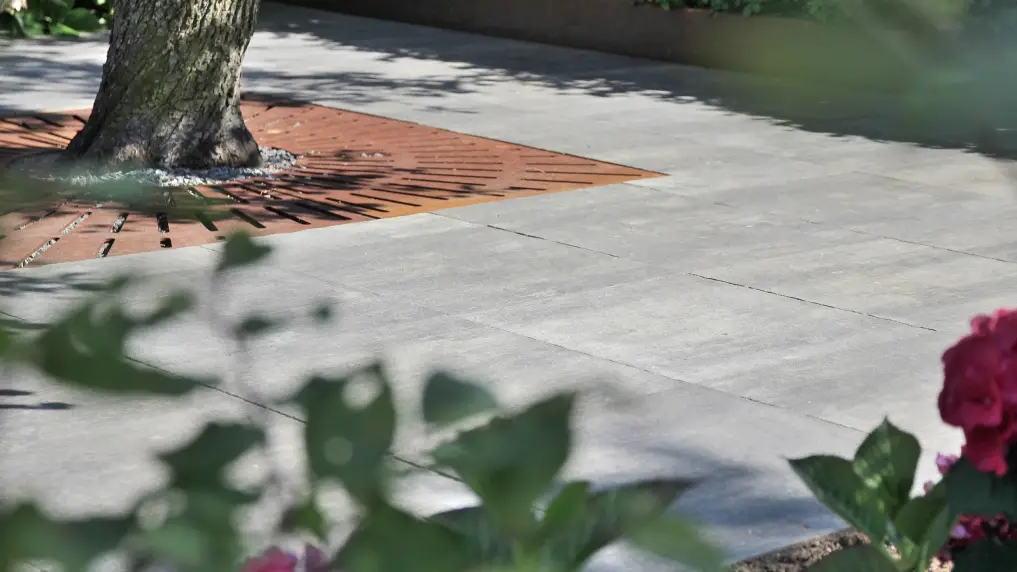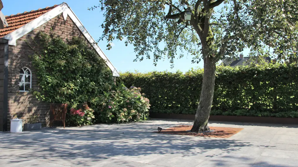 Het cortenstaal van de border komt terug in de op maat gemaakte roosters onder de perenboom. Deze boom wordt ’s avonds mooi uitgelicht door middel van een grondspot, zodat het landelijke en natuurlijke karakter van de tuin ook in de avonduren wordt benadrukt.