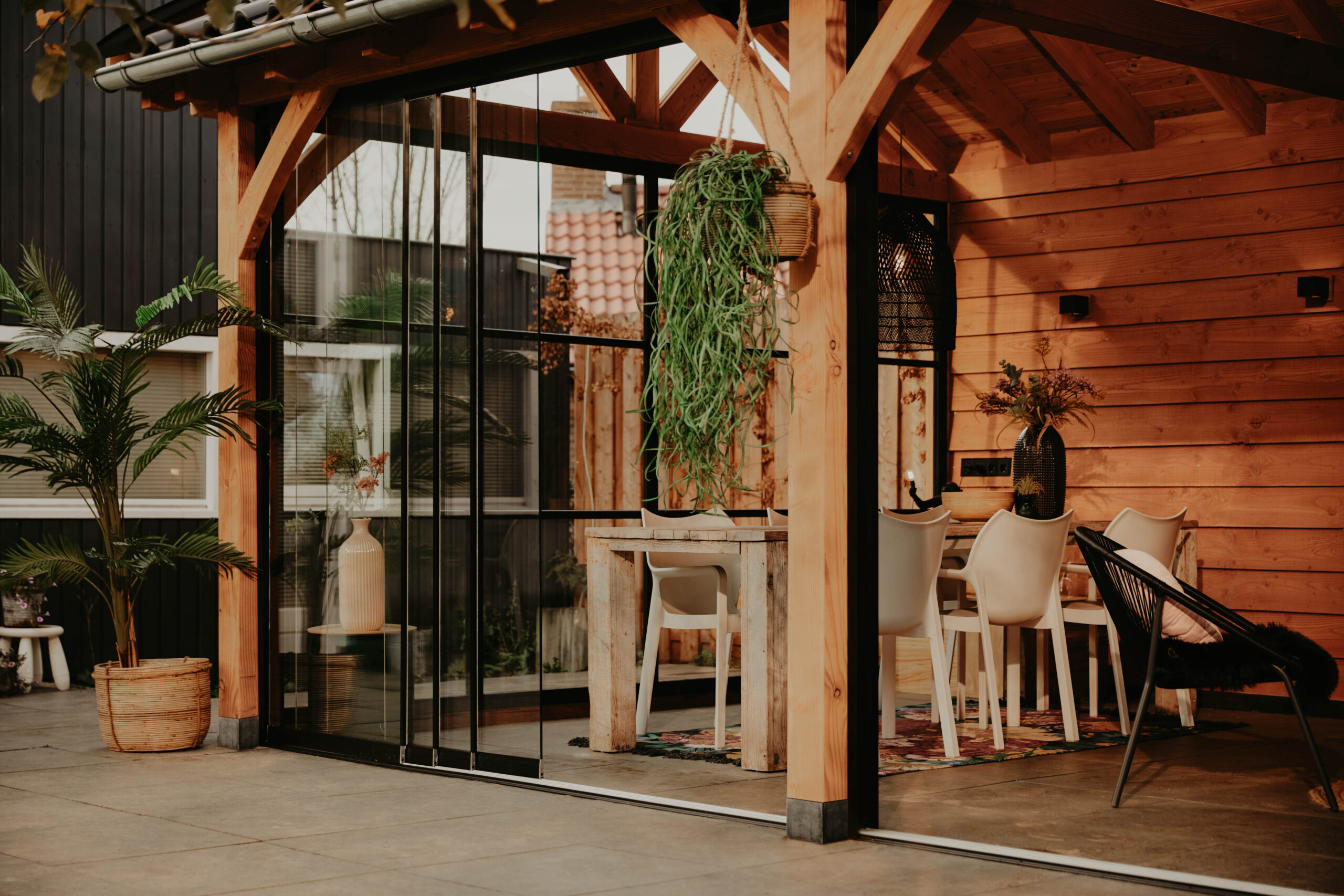 Met de extra mogelijkheden is de blokhut of overkapping volledig op te bouwen conform uw wensen en eisen. Breid uw overkapping bijvoorbeeld uit met glazen schuifwanden, waarmee u uw overkapping kunt afsluiten, terwijl het uitzicht op uw tuin behouden blijft.