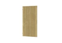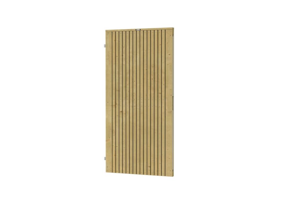 Een schuttingdeur van kleine vuren houten latjes, waarin een verzinkt stalen frame is verwerkt. Deze zorgt voor extra stevigheid en kan naderhand nog nagesteld worden. Deze deur is alleen linksdraaiend toe te passen.