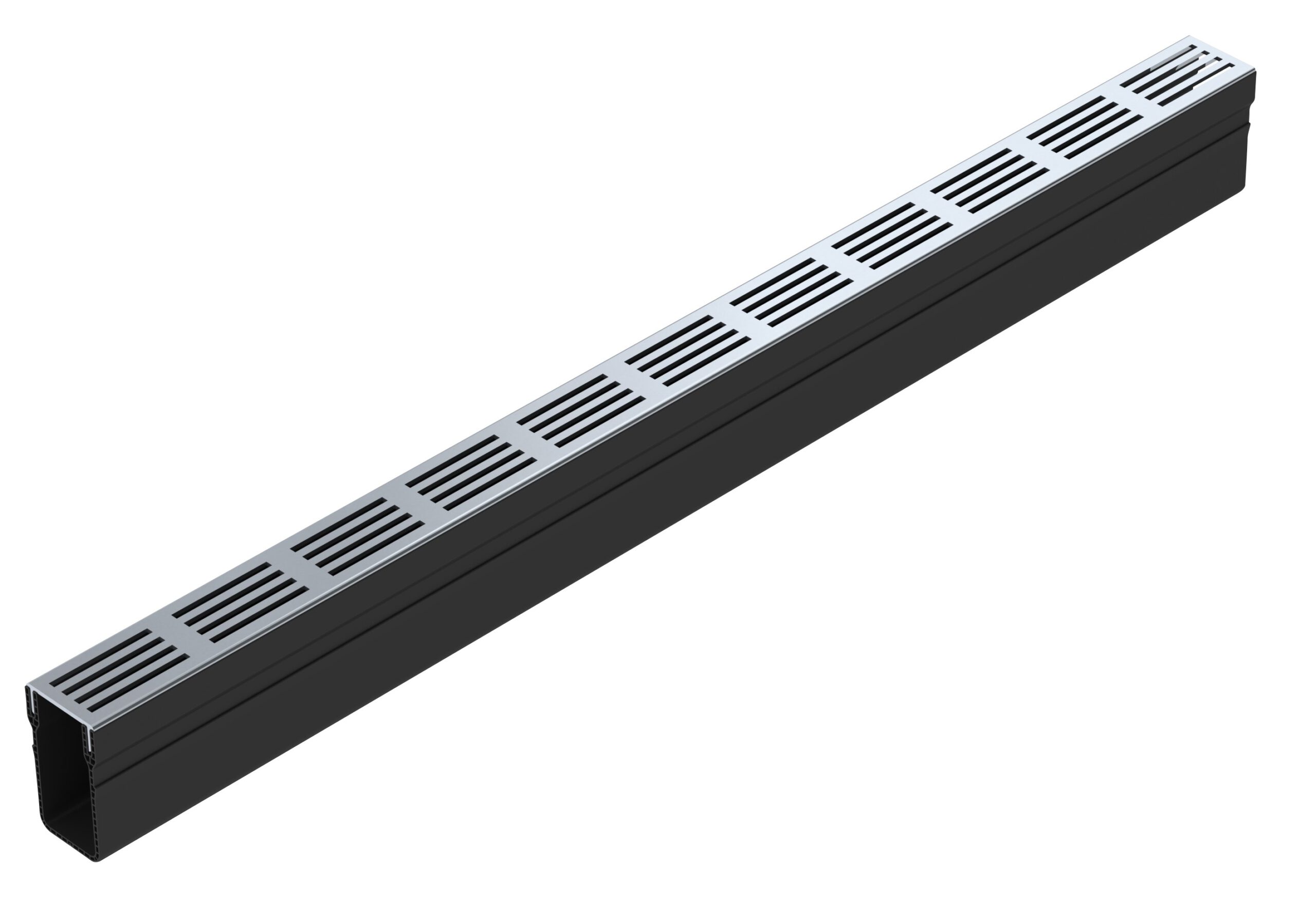 Een ultra smalle kunststof goot met blank aluminium designrooster. Een sieraad in een strak modern vormgegeven terras.